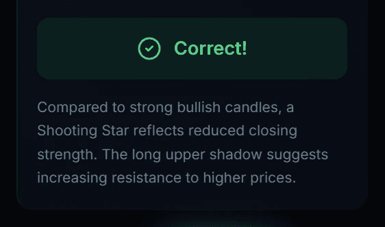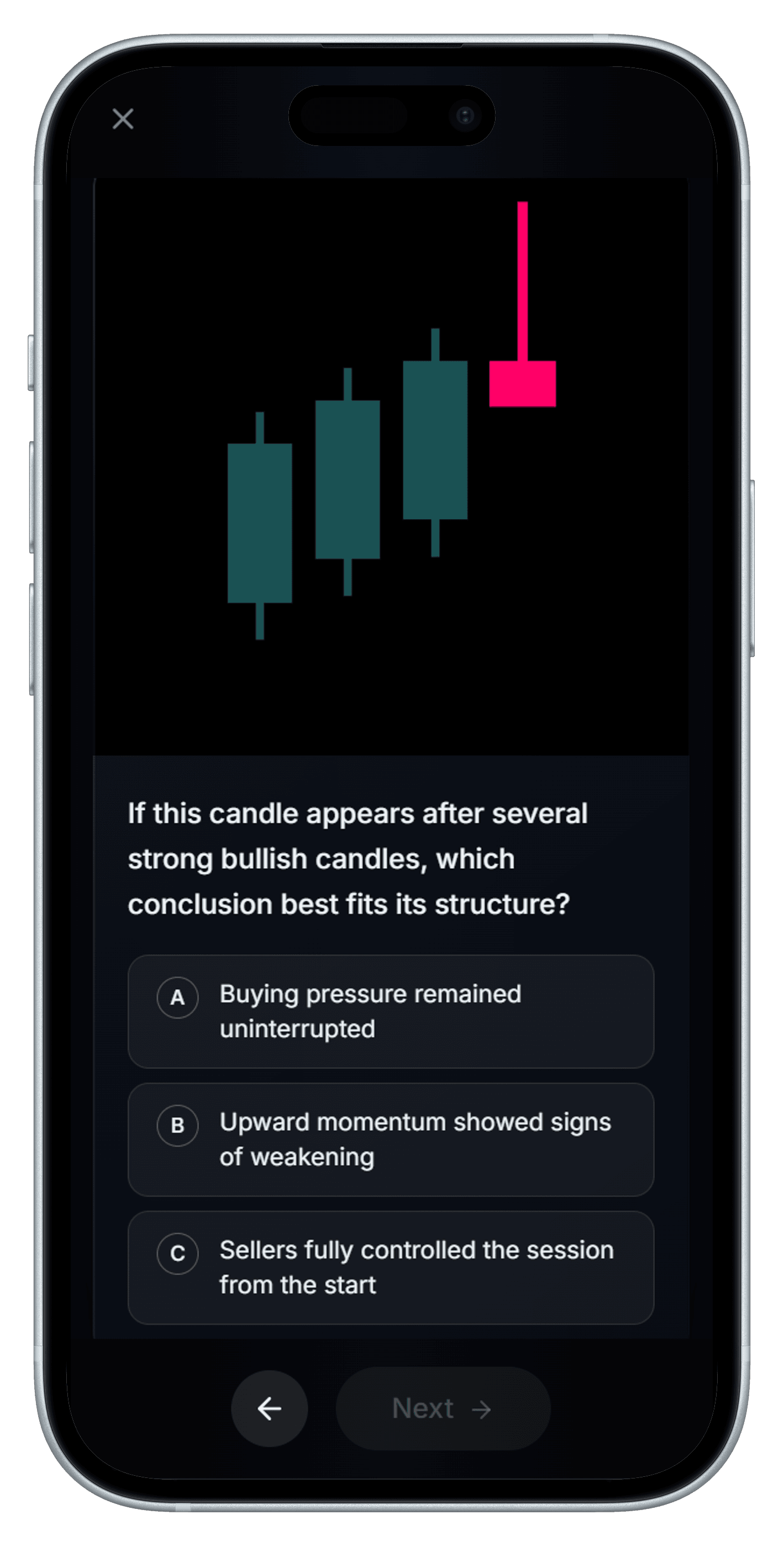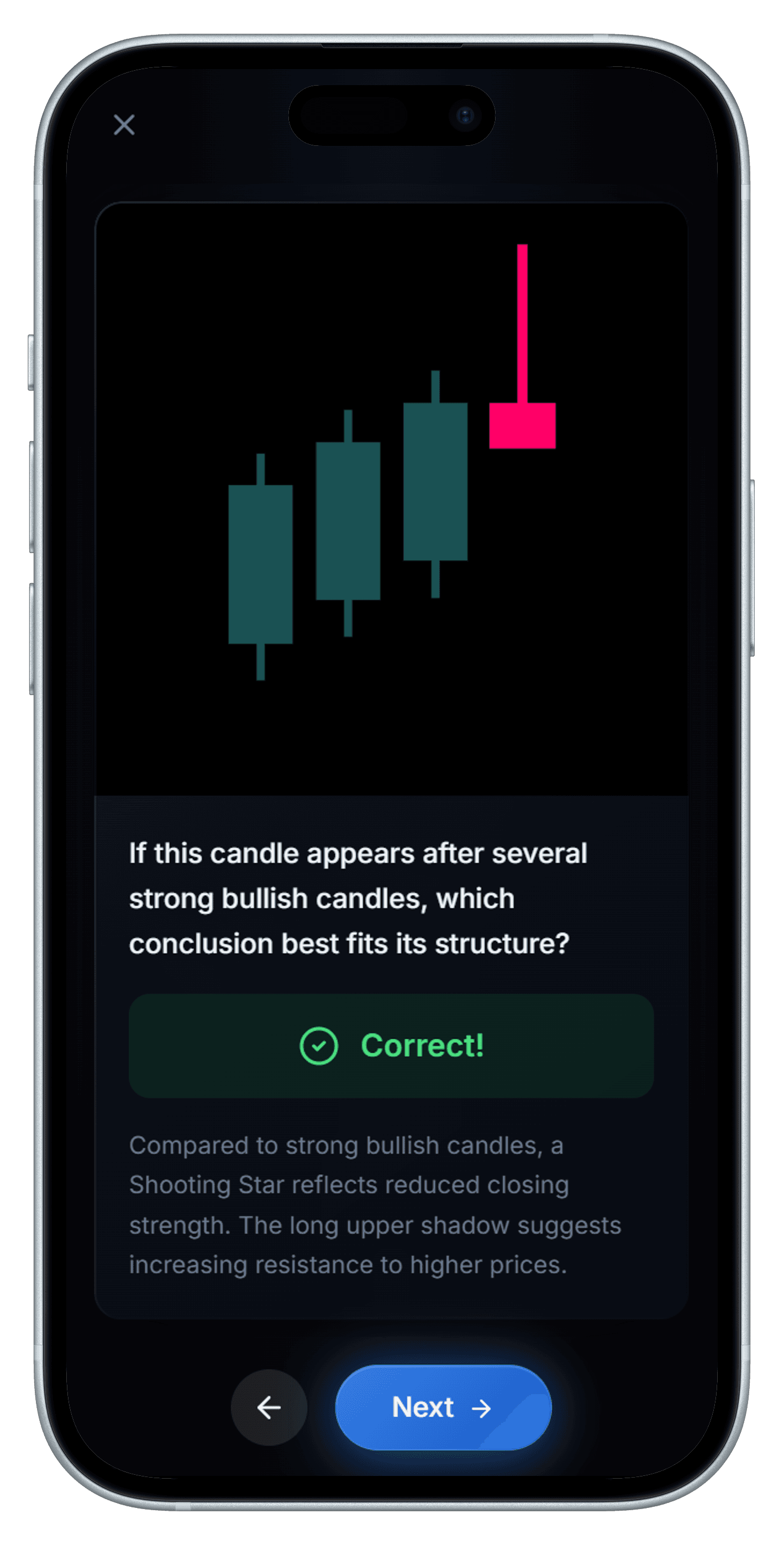 Solve hundreds of candlestick snapshots in minutes. Repetition builds instant recognition.